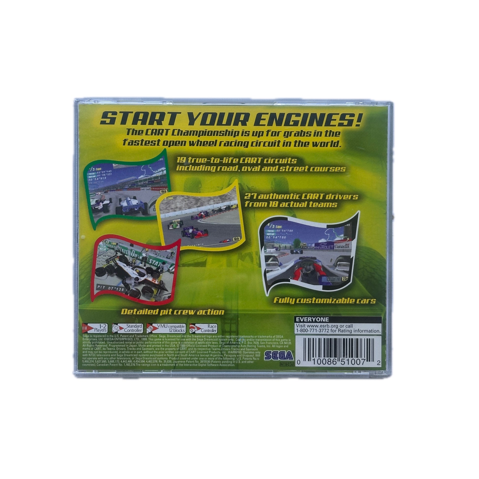 Flag to Flag is a racing game for the Sega Dreamcast, developed by Zoom, Inc. and published by Sega. It was released in 1999 and offers an arcade-style go-kart racing experience with international tracks, multiplayer modes, and customizable karts. The game features 19 true-to-life CART circuits, including road, oval, and street courses, and includes 27 authentic CART drivers from 18 actual teams. Players can also customize their cars and experience detailed crew action