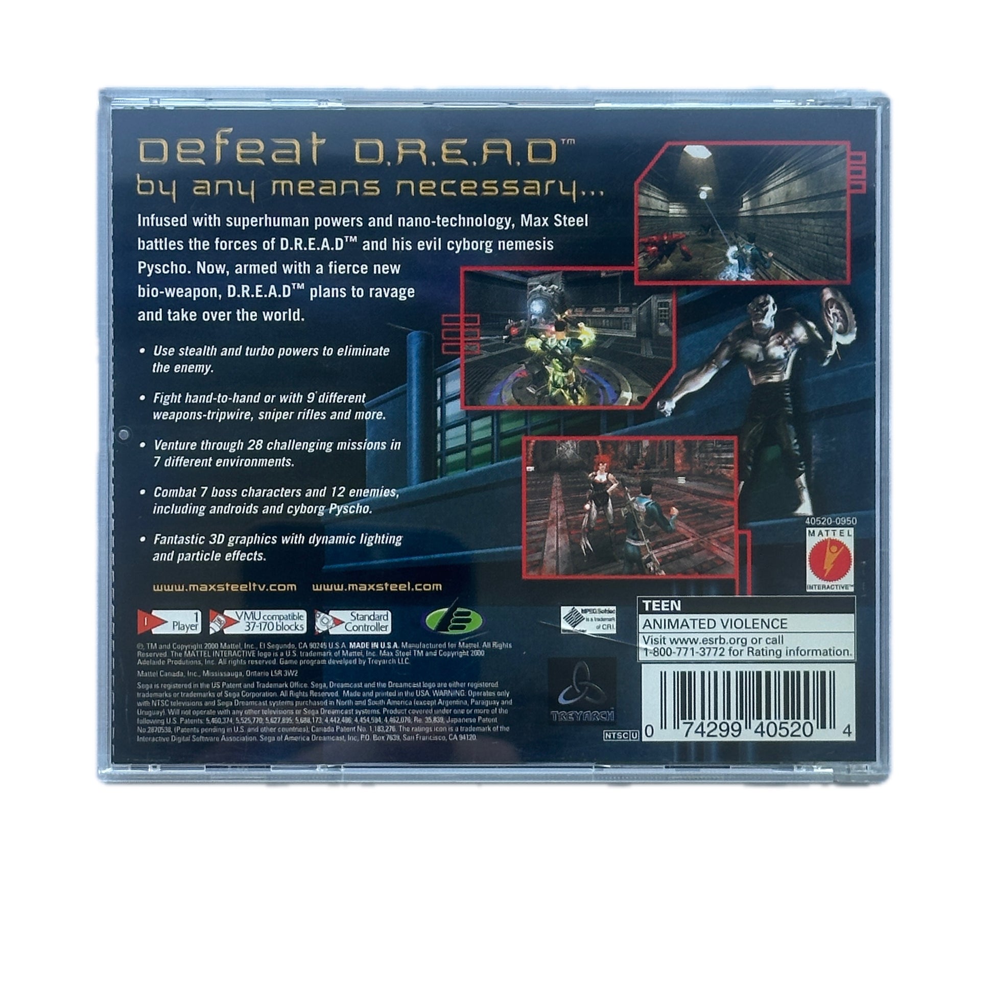 The game was developed by Treyarch and published by Mattel Interactive, and it was released for the Dreamcast exclusively in North America on December 5, 2000. Max Steel Covert Missions is a first-person shooter that features a plot where Max Steel, infused with superhuman powers and nano-technology, battles the evil forces of D.R.E.A.D and his evil cyborg nemesis Psycho. The game received mixed reviews according to the review aggregation website Metacritic, with some critics praising the game's graphics and soundtrack while others found it disappointing. Despite the mixed reception, the game has a dedicated fan base and is available for purchase on various platforms, including Amazon, where it is listed as a Sega Dreamcast game. The game's unique blend of action and adventure, combined with its engaging storyline, makes it a notable title in the Sega Dreamcast library.