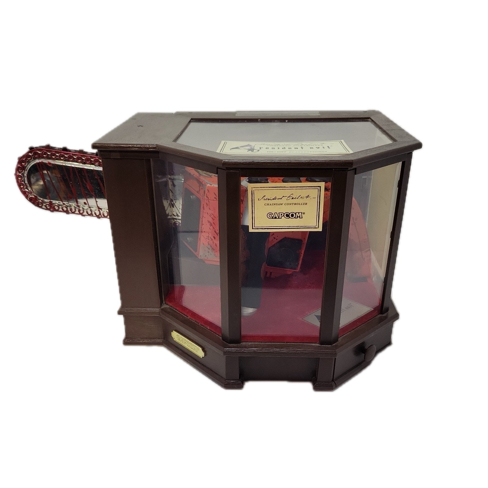 The Resident Evil 4 Chainsaw Controller for PlayStation 2 is a unique and collectible peripheral designed to enhance the immersive experience of playing Resident Evil 4. This controller is shaped like a chainsaw, featuring a blood splattered design that closely resembles the in-game chainsaws used by the Chainsaw Ganados. It comes with a faux-rock display stand, allowing it to be showcased as a piece of gaming memorabilia. The controller includes a controller cable, instruction manual, and display case, making it a complete package for enthusiasts. While the design is primarily focused on collectability, the controller is fully functional and can be used to play Resident Evil 4 and other compatible games. However, its button layout is known to be somewhat unintuitive, making it more of a novelty item than a practical gaming peripheral. Despite this, it remains a highly sought-after item among fans and collectors, The controller's packaging is also designed to look like a set of three-paned, double windows from a dark and dreary cabin, adding to its thematic appeal. Whether you're a dedicated fan of the Resident Evil series or a collector of unique gaming peripherals, the Chainsaw Controller for PlayStation 2 offers a distinctive and memorable addition to any gaming setup.