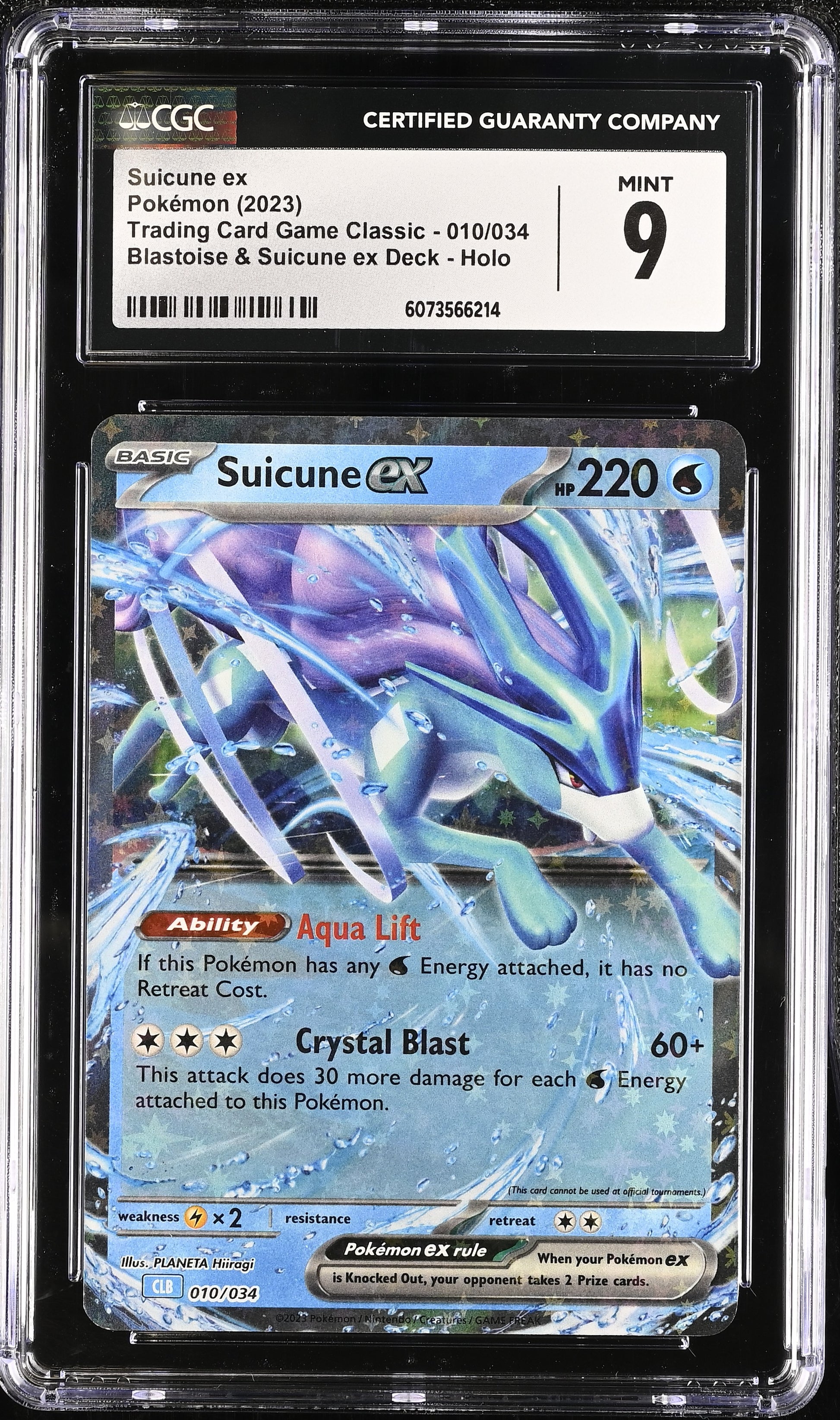 Suicune ex 10/34 from the Blastoise & Suicune ex Deck is a Holo Rare Basic Water-type Pokémon ex with 220 HP, featuring artwork by PLANETA Hiiragi. This card is part of the Pokémon Trading Card Game Classic collection, a reissue of classic cards with modern finishes. It includes the Aqua Lift Ability, which removes its retreat cost if any Energy is attached, and the Crystal Blast (60+) attack, dealing an additional 30 damage for each Energy attached. As a Pokémon ex, it grants 2 Prize cards when knocked out.