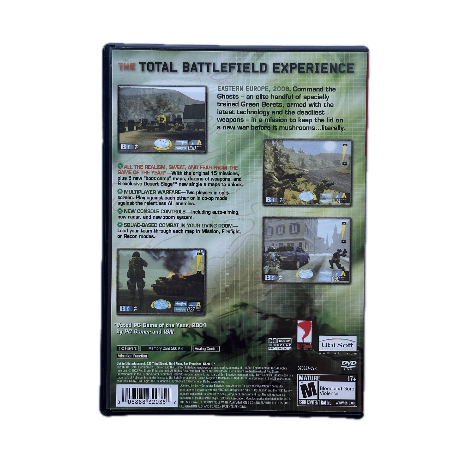Tom Clancy's Ghost Recon Greatest Hits for the PlayStation 2 is a tactical military shooter that immerses players in the role of an elite U.S. Army Green Beret leading a team of specialists on high-stakes missions. The game features 20 different 400m by 400m areas, offering a variety of terrains including mountains, forests, cities, and beaches, all rendered with dynamic lighting, multi-texturing, and ragdoll physics for a realistic experience. Players can unlock 12 specialists, each with unique skills and weapon kits, allowing for strategic gameplay as they navigate through intense combat scenarios and complete missions behind enemy lines.