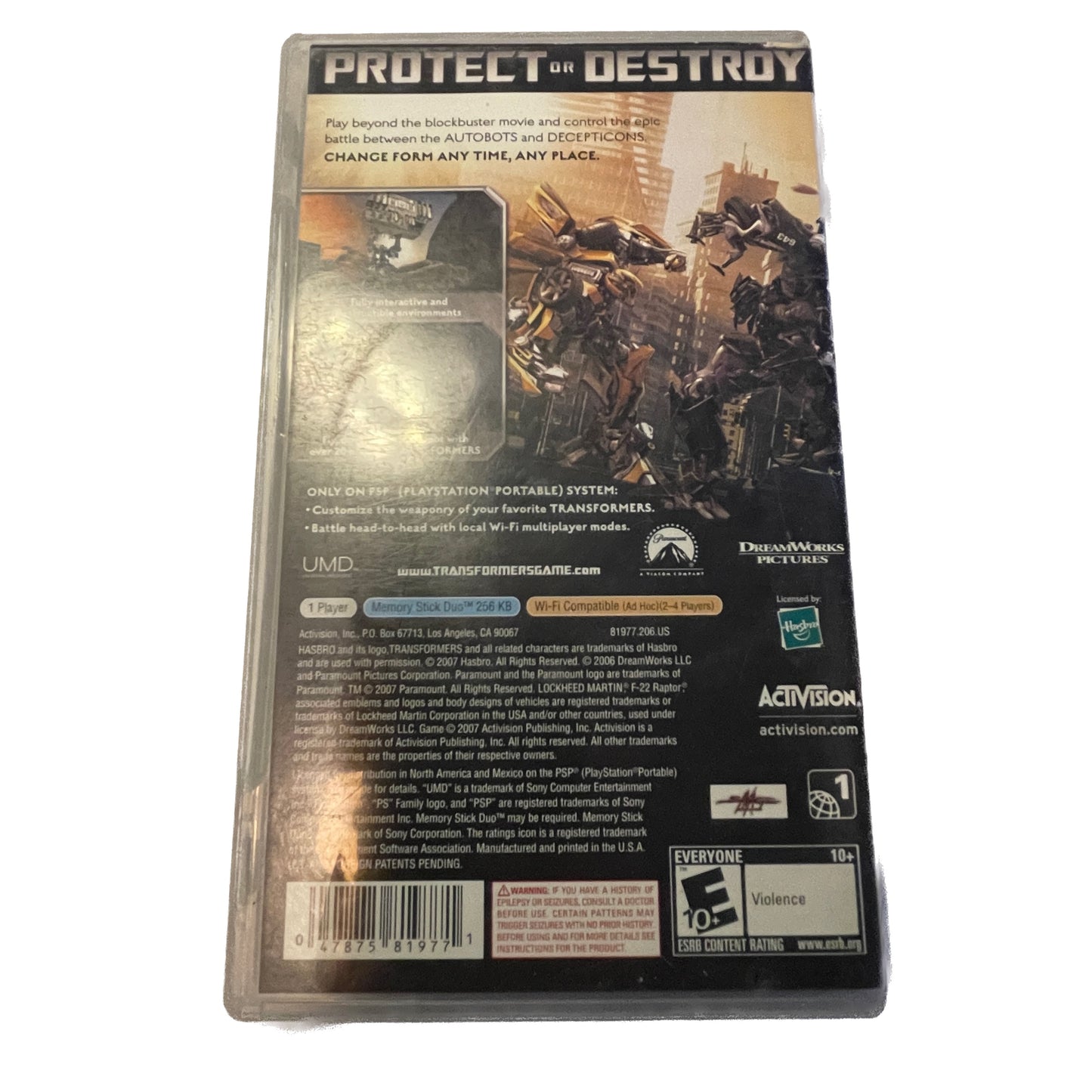 Transformers: The Game is a third-person shooter video game created by Savage Entertainment and published by Activision. It was released on June 26, 2007, for the Sony PSP handheld console. The players assume the roles of either the Autobots or Decepticons, two factions of transforming robots from the popular Transformers franchise. The game is based on the 2007 live-action film directed by Michael Bay. It follows the film's storyline as players control the Autobots or Decepticons in their fight for domination over Earth. The game features include two playable factions, two campaigns with unique storylines and missions, a variety of playable characters such as Optimus Prime, Bumblebee, and Megatron, and transforming robots with special abilities and attacks. Additionally, there is a multiplayer mode for both competitive and cooperative gameplay.